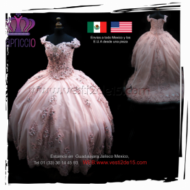 Descripción: Lindo vestido de quinceañera princesa en color rosa blush con encaje y mangas caídas al hombro