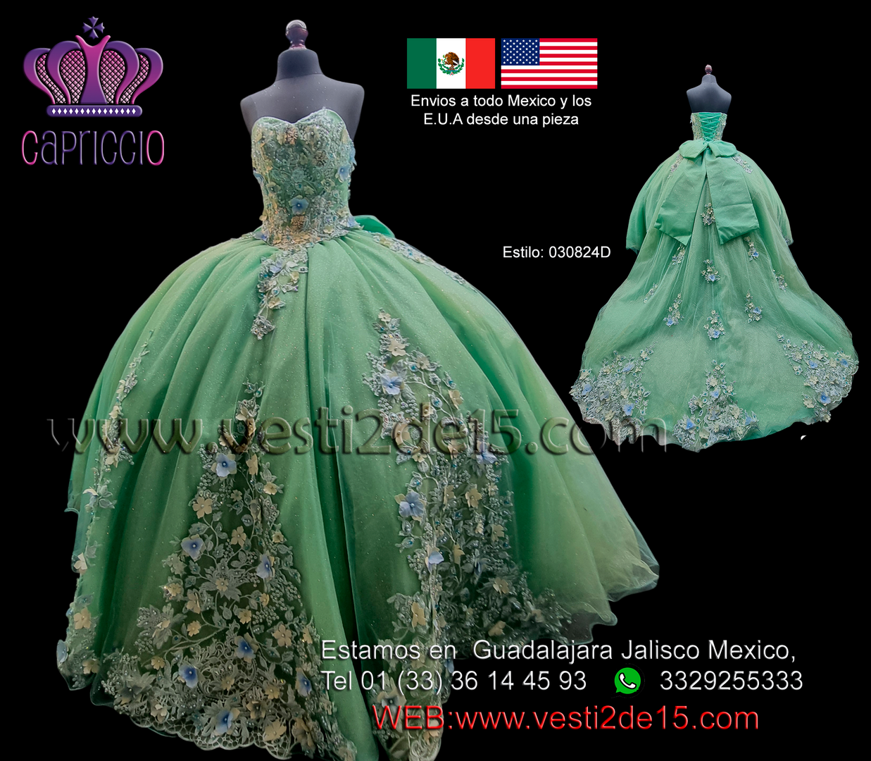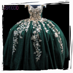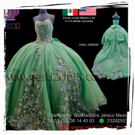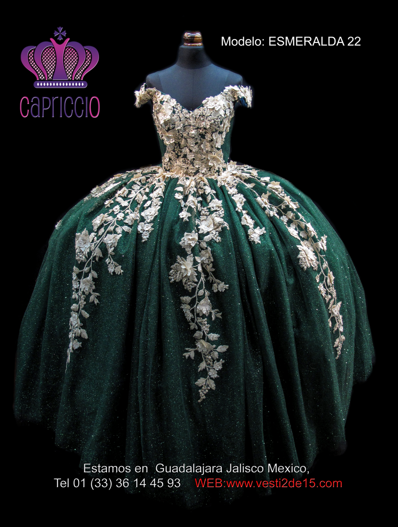 Descripción: Vestido para quinceañera en color esmeralda con decoraciones en encajes al tono