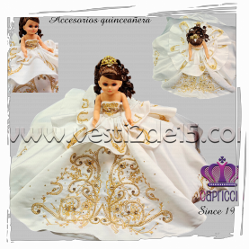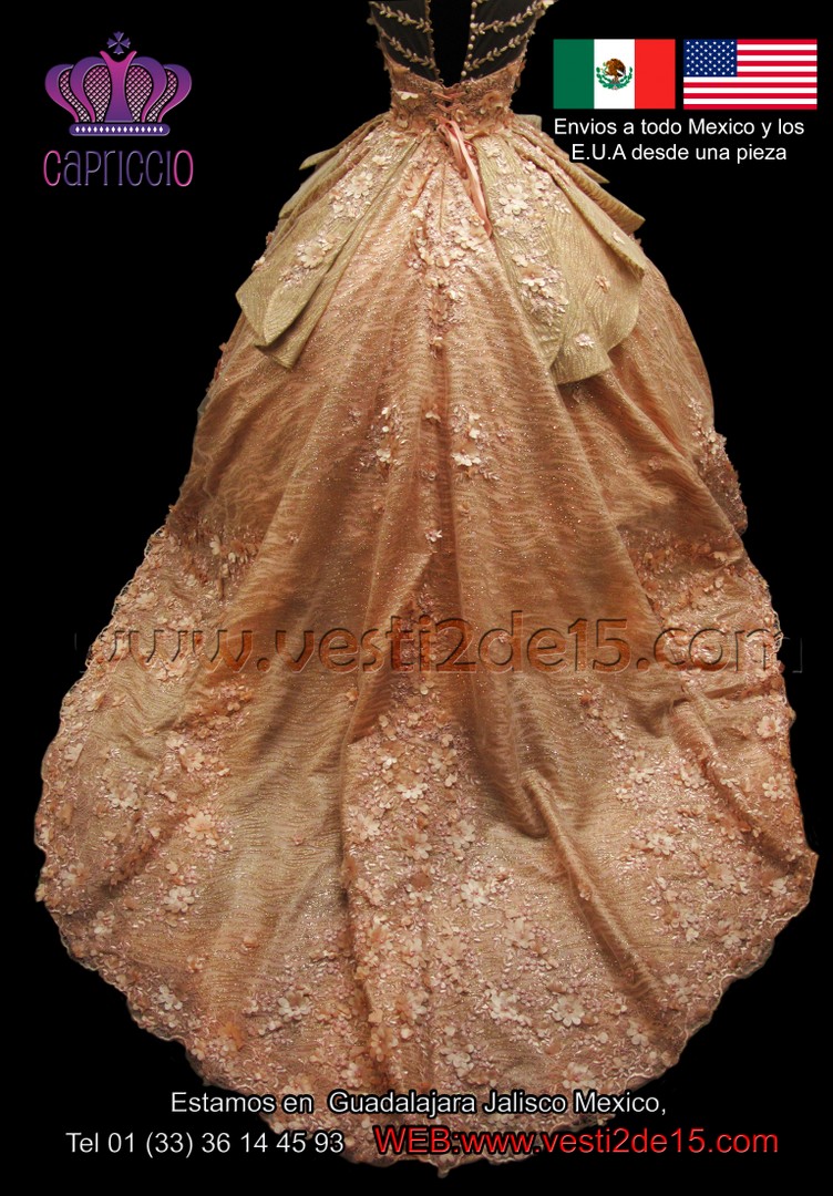 Descripción: Es un lindo vestido para festejar tus 15 años con este vestido dorado con dos tonos de encaje oro