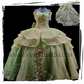 Descripción: Vestido para quinceañera en verde en estilo princesa con detalles de encaje con tematica de Ana y el Sapo