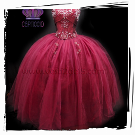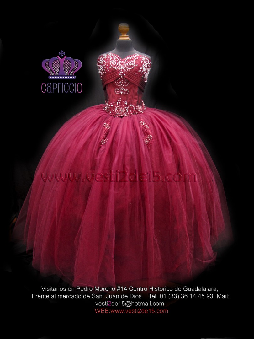 Descripción: Vestido para quinceañera en color tinto con aplicaciones d encaje bordado de pedrería y olanes de organza en la falda