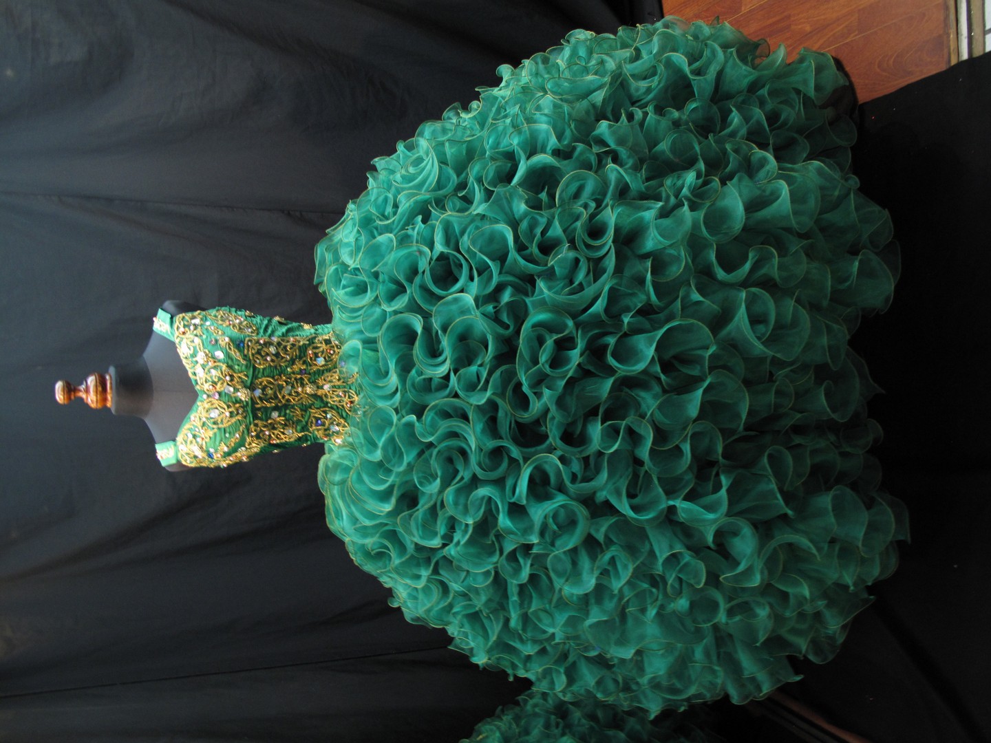 Descripción: Vestido dorado de olanes con orilla de bies