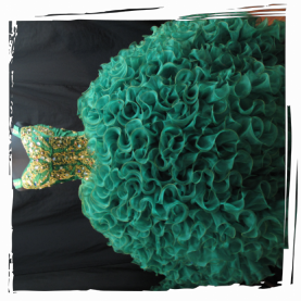 Descripción: Vestido en tono verde esmeralda con aplicaciones de encaje corte princesa